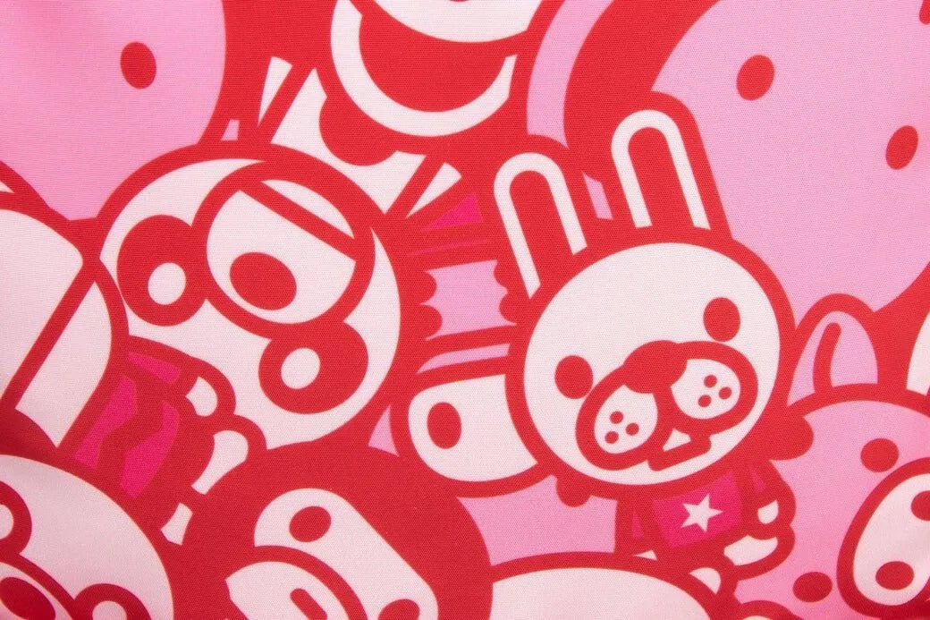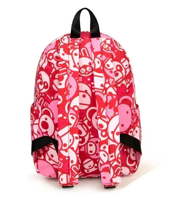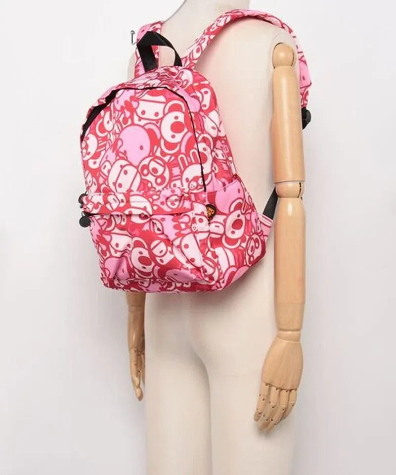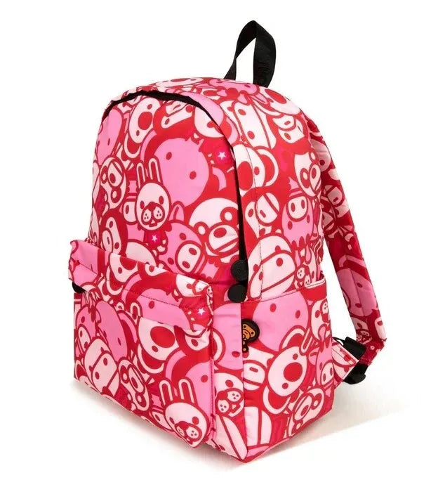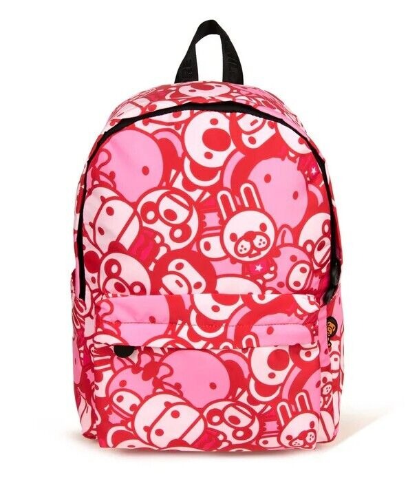 Add a playful and stylish touch to your everyday look with the BABY MILO CAMO ALL FRIENDS PRINT MEDIUM BACKPACK in vibrant pink. This eye-catching backpack features an all-over print of beloved Baby Milo characters and their friends in a fun, scattered pattern, making it a lively accessory for any outing. It's the perfect way to carry your essentials while showcasing your love for BAPE's iconic playful aesthetic.