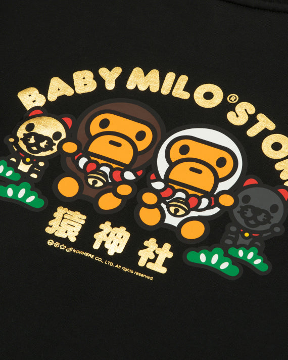 Celebrate the charm of BABY MILO® with this cozy crew neck sweatshirt. Crafted in a sleek black hue, this sweatshirt features an intricately embroidered BABY MILO® motif on the chest and a vibrant back graphic showcasing BABY MILO® alongside lucky cat designs, adding a playful and auspicious touch to your wardrobe. Its soft fleece material ensures warmth and comfort, making it a perfect layering option for cooler seasons. Embrace the blend of style and comfort with this versatile piece, ideal for casual outings or lounging in style.