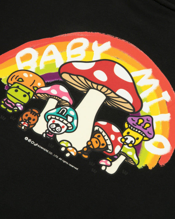 Showcasing Baby Milo and friends in a colorful mushroom-themed design on the back, this sweatshirt brings a playful and unique flair to your casual wardrobe. The front features an embroidered Baby Milo in a mushroom cap for a charming and subtle detail. Made from a soft and cozy material, this sweatshirt keeps you comfortable while letting you express your bold style.