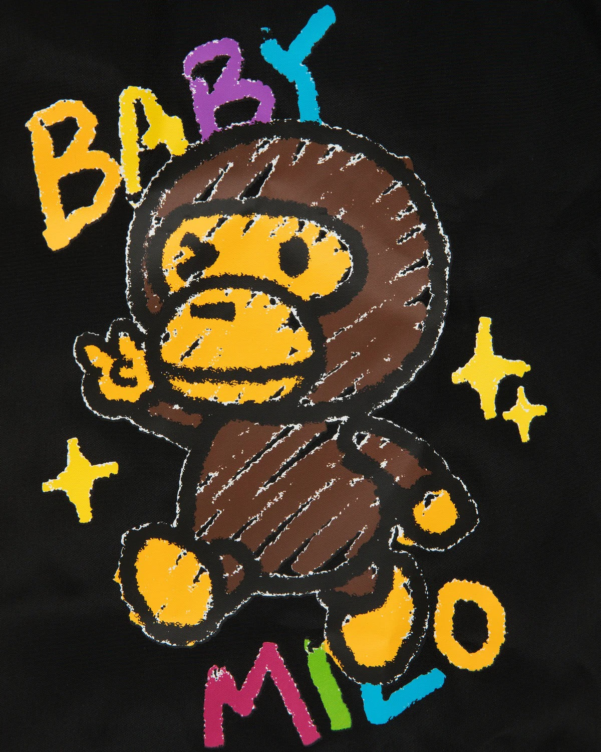 - Black base with vibrant multicolor "BABY MILO" text and playful crayon-style Baby Milo print.