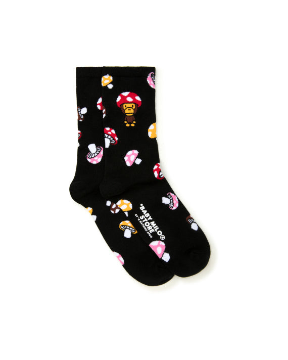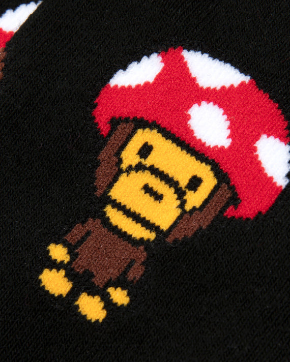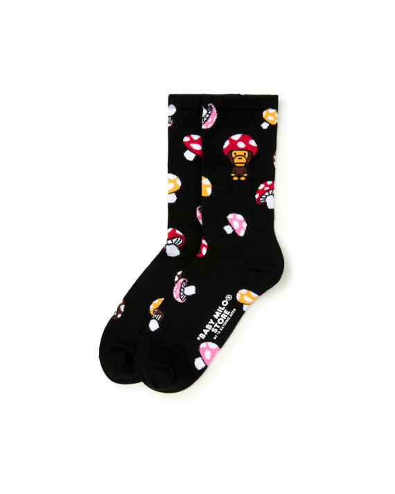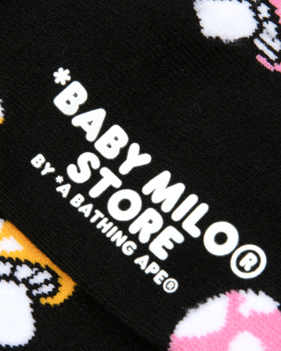 Step into a playful world of fun with the Baby Milo Mushroom Socks in black. These socks feature a delightful pattern of Baby Milo donning a red mushroom hat, accented by scattered mini mushrooms in red and yellow. The soft cream background brings out the bold and vibrant colors, making these socks a charming addition to your everyday wardrobe.