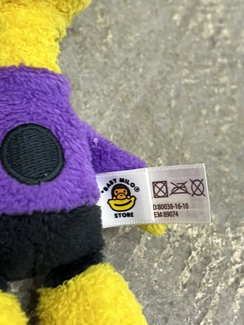 Color: Primarily vibrant yellow plush with a purple long-sleeved top and black shorts.