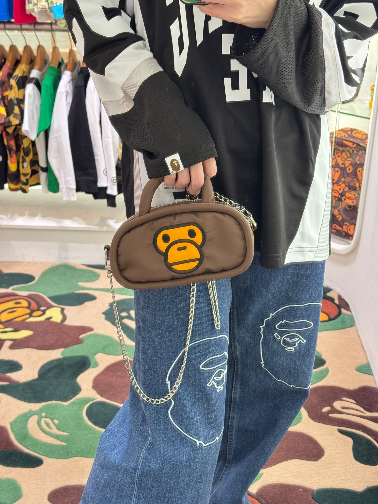 You'll love this bag because it is the ultimate expression of playful streetwear and high emotional value. It is truly a wearable piece of art—a collectible item that you can use every day. The smooth, easy-to-clean surface makes it functional, while the doll shape instantly elevates a simple outfit (OOTD) and guarantees attention. Since it's large enough to hold necessities like your phone and even a small bottle of water, you don't have to choose between unique style and everyday practicality. It’s a bold accessory that lets you showcase your unique personality and your love for BAPE culture.