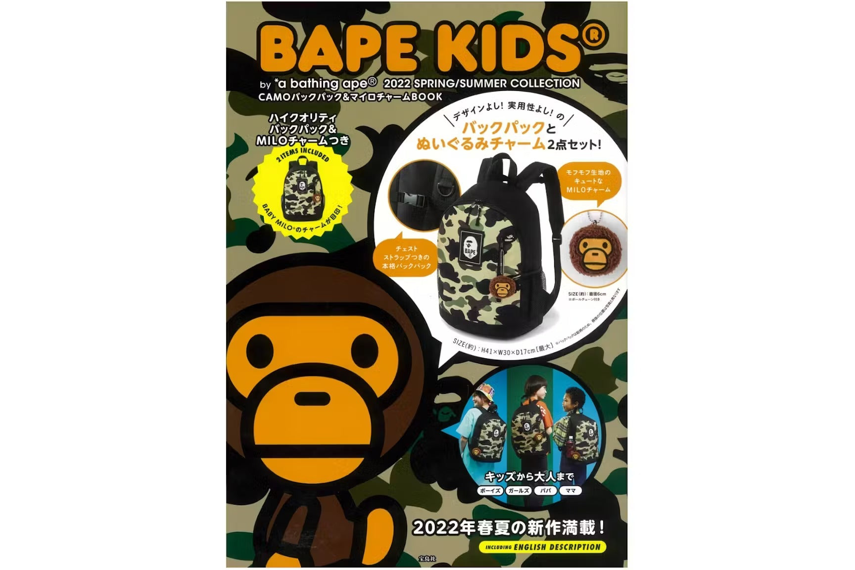 BAPE KIDS® BY A BATHING APE® 2022 SPRING/SUMMER COLLECTION CAMO BACKPACK & MILO CHARM BOOK