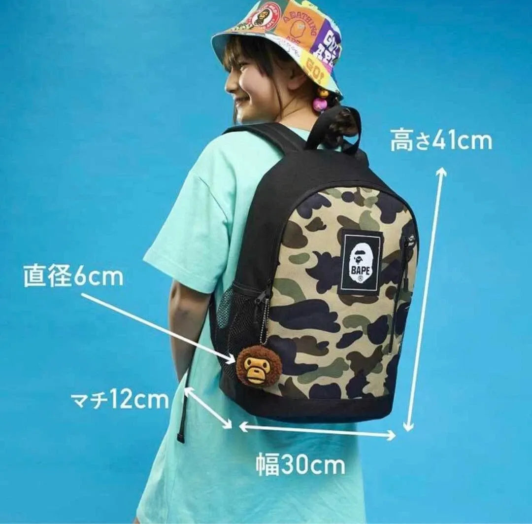 This product is an exclusive set that was released as part of a Japanese BAPE Kids magazine e-mook for the 2022 Spring/Summer Collection. The set includes a high-quality backpack featuring the iconic BAPE® camo print and a matching plush Baby Milo charm. It's a stylish and practical item that is suitable for both kids and adults.