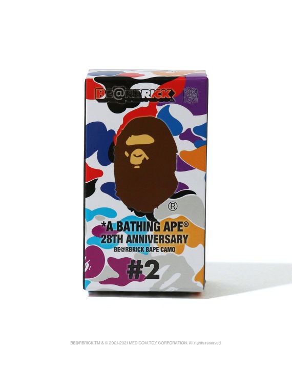 Celebrate a major milestone for A Bathing Ape with this special collectible: the Bearbrick x BAPE 28th Anniversary Camo #2 in the popular 100% size. This miniature art toy features a striking blend of BAPE's iconic camouflage patterns, specifically in PURPLE/ BLUE/ ORANGE tones, with a distinct white chest proudly displaying the classic APE HEAD logo. This specific design is one of 8 unique patterns released to commemorate BAPE's 28th anniversary, making it a highly collectible piece.