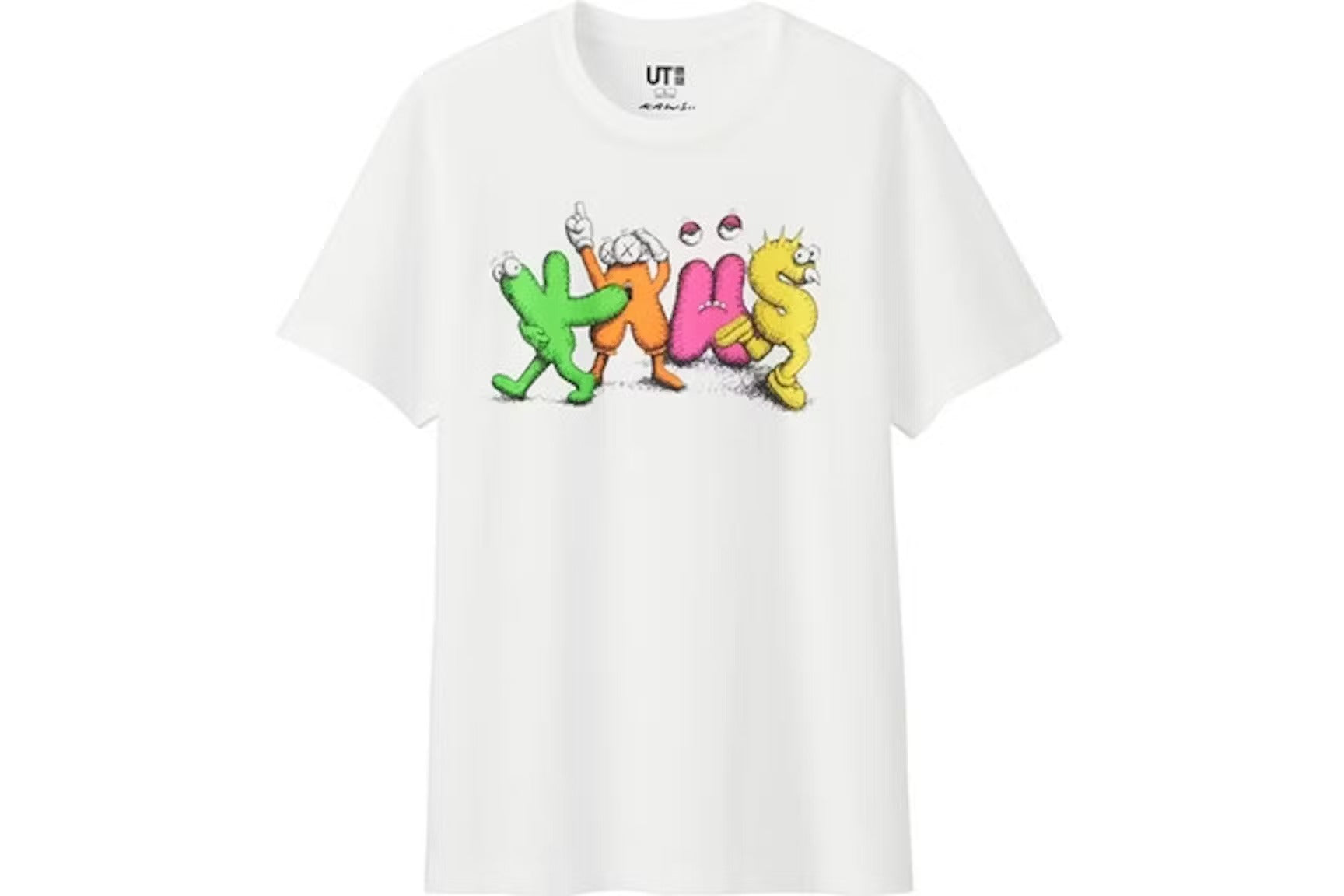 Design: A white T-shirt with a vintage-style graphic of multiple colorful KAWS characters.