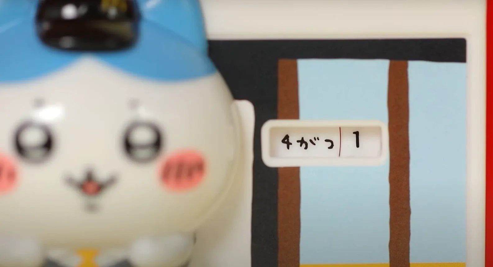This is a special toy from the McDonald's Happy Meal collection for 2025, featuring a collaboration with the popular Japanese franchise, Chiikawa. The toy showcases the beloved character Hachiware, who is dressed in a McDonald's uniform. This limited-edition item is more than just a figure; it's a small, interactive calendar, making it a cute and functional collectible for fans.
