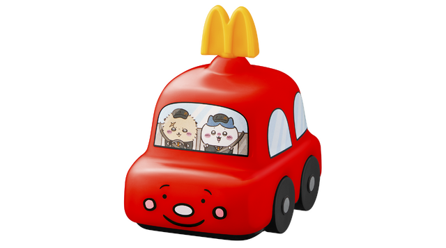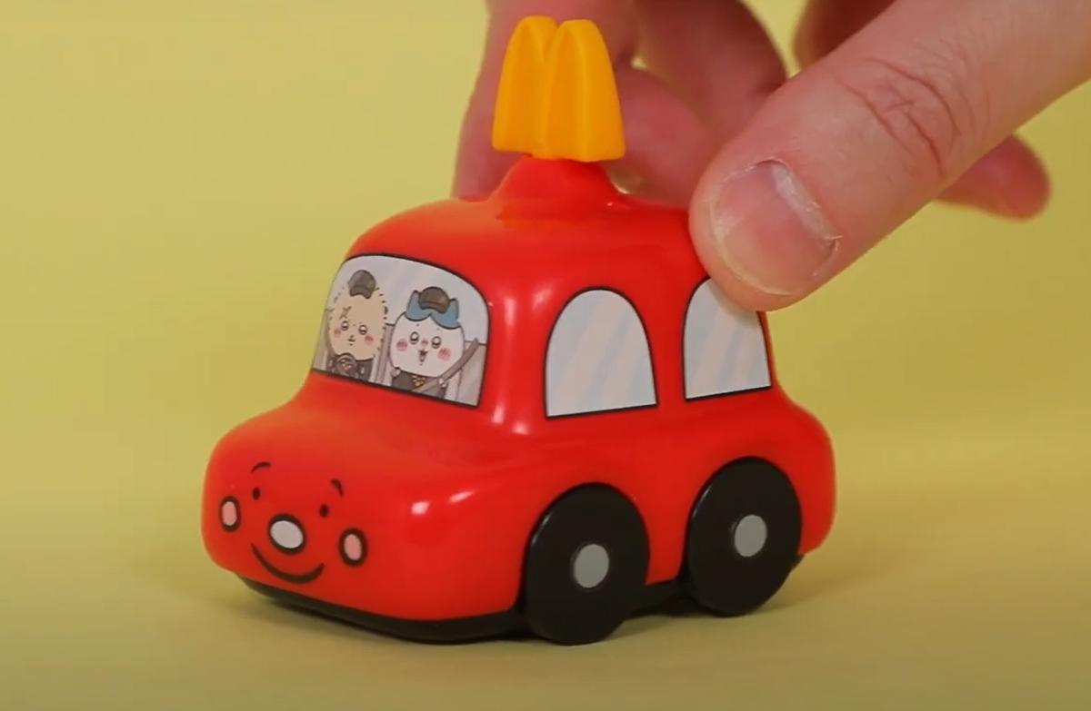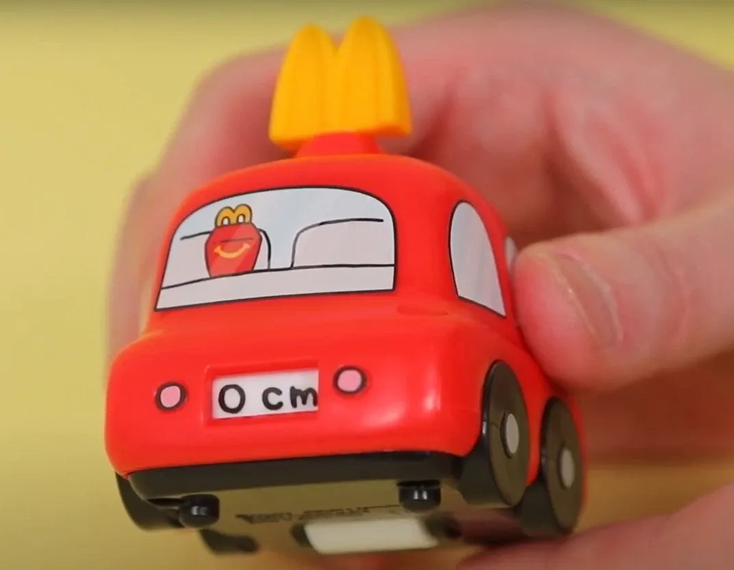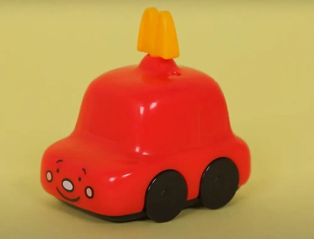 Design: The toy is a red car with Racco visible in the driver's seat. A yellow McDonald's 'M' logo is on top of the car.